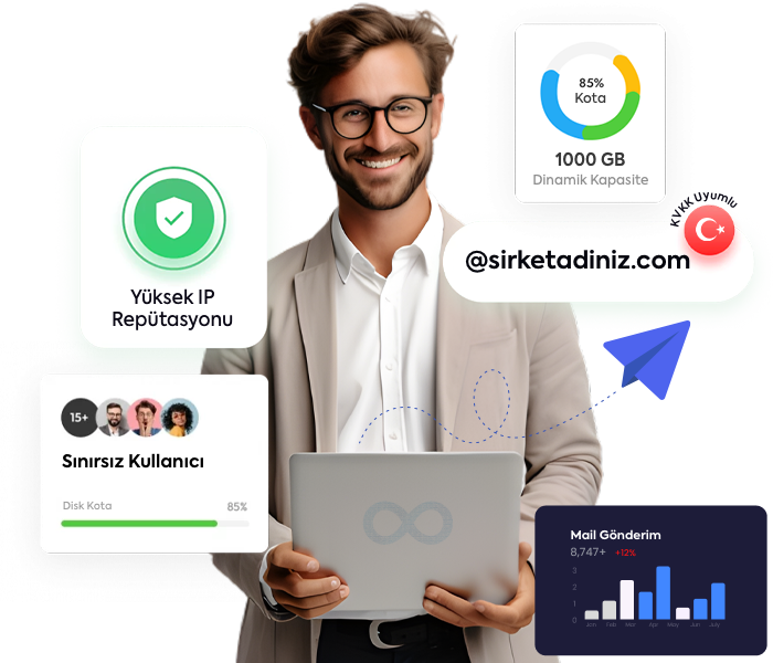 İşletmenizin sahip olduğu alan adını e-posta hesaplarınız için de kullanarak kurumsal e-posta adreslerine kavuşun! Kullanıcılara özel sınırsız e-posta hesapları oluşturarak şirketinizin kurumsal görünümüne değer katın!